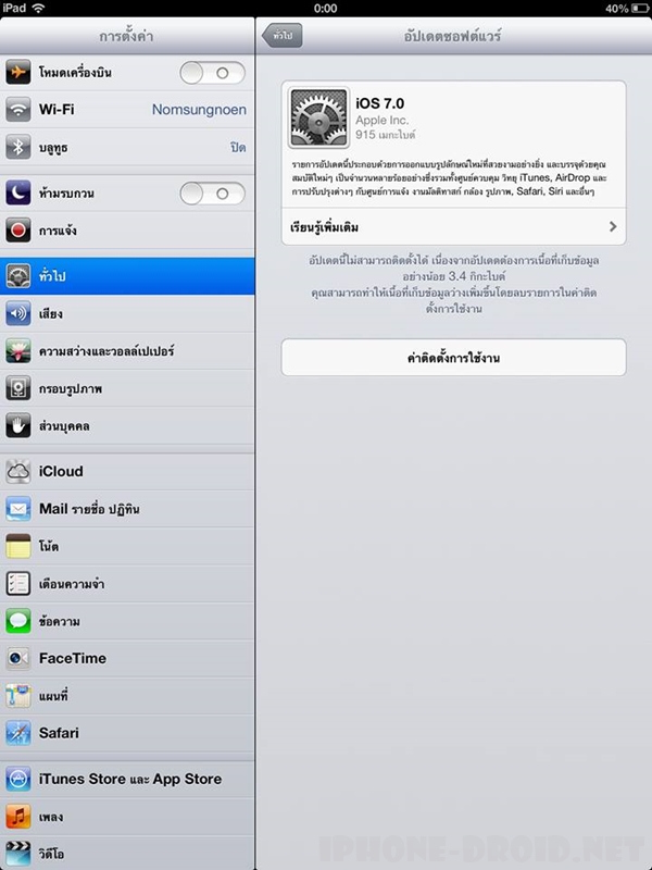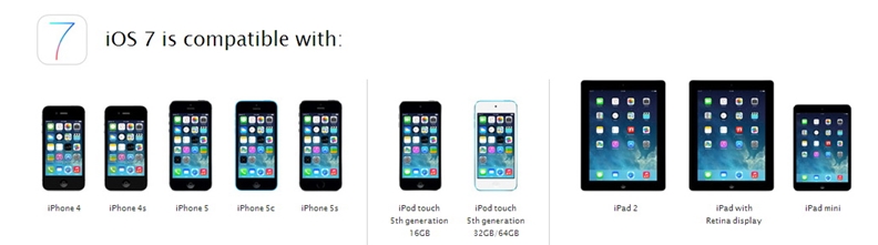 รุ่นที่สามารถอัพเดท iOS 7 ได้ : iPhone4, iPhone 4S, iPhone 5, iPhone 5c, iPhone 5s, iPad 2, iPad 3, ipad 4, iPad mini และ iPod touch 5