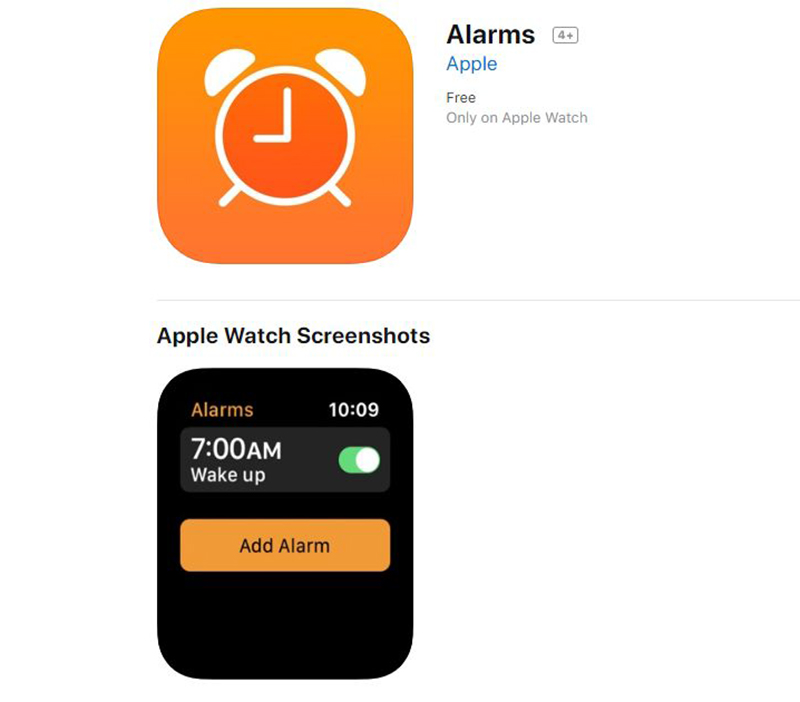 แอปพลิเคชั่น Alarms ได้ถูกบันทึกหน้าจอเอาไว้ผ่าน Apple Watch App Store รวมไปถึงฟีเจอร์ Sleep ที่เหมือนกับเป็นนาฬิกาปลุกและเก็บข้อมูลและหว่างนอนกลับได้ ซึ่งจากภาพดังกล่าวจะมีการตั้งเวลานอนหลับและเวลาตื่นเพื่อที่จะให้เราได้นอนเป็นเวลามากขึ้น โดยเราอาจจะได้ใช้กันจริงๆ ในการอัปเดทครั้งหน้า