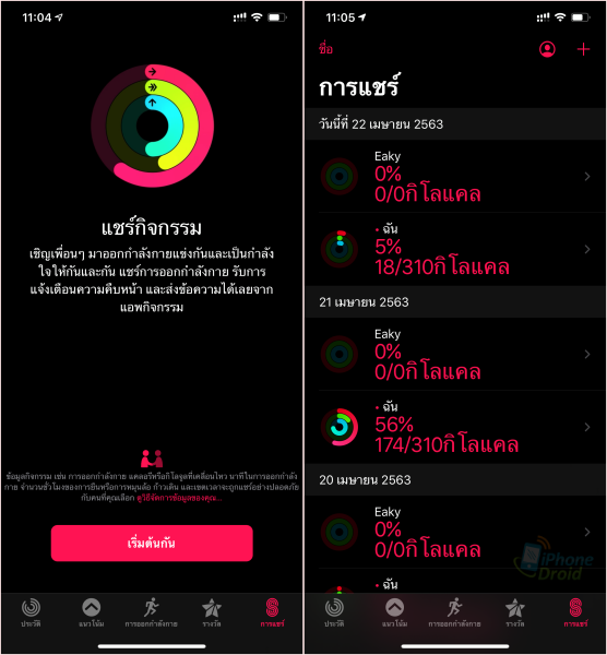 กระตุ้นตนเองด้วยการแข่งกันรักสุขภาพ คุณสามารถท้าทายเพื่อนให้มาร่วมแข่งขัน โดยคุณจะได้รับคะแนนสำหรับทุกๆ เปอร์เซ็นต์ที่คุณเพิ่มลงในวงแหวนกิจกรรมในแต่ละวัน การแข่งขันจะมีเวลา 7 วัน และคุณสามารถทำคะแนนได้มากถึง 600 คะแนนต่อวัน คนที่มีคะแนนสูงที่สุดหลังจากจบการแข่งขันจะเป็นผู้ชนะ ในระหว่างการแข่งขัน การแจ้งเตือนจะบอกคุณว่าคุณกำลังนำหรือตามหลังอยู่ พร้อมกับสามารถส่งข้อความท้าทายและให้กำลังใจกันได้ สามารถดูข้อมูลเพิ่มเติมได้ที่ https://support.apple.com/th-th/HT207014