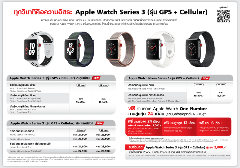 - ฟรีค่าบริการ Apple Watch One Number นาน 12 เดือน สำหรับแพ็กเกจรายเดือน 1,099 บาทขึ้นไป (โปรโมชั่นนี้สำหรับลูกค้าใหม่ และลูกค้าปัจจุบัน)
