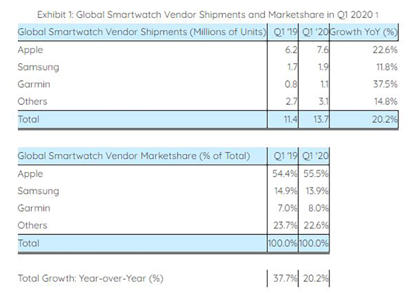 Strategy Analytics รายงานว่า Apple Watch มียอดส่งออกโตขึ้นถึง 22.6% เมื่อเทียบกับปี 2019 ในช่วงเดียวกัน คิดเป็น 7.6 ล้านชิ้น จากเดิม 6.2 ล้านชิ้น และคิดเป็น 55.5% ของส่วนแบ่งการตลาดเลยทีเดียว