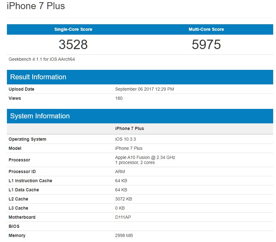 ตามข้อมูลจาก Geekbench เป็นการทดสอบด้วย iPhone10,5 ซึ่งเป็นรุ่นใหม่แน่นอน แต่ยังไม่แน่ชัดว่าเป็น iPhone 8, iPhone 8 Plus หรือ iPhone X แต่จุดน่าสนใจคือตัวชิปเซ็ตที่มีซีพียู 6-core หรือ Hexa-core กับแรม 3GB และรันระบบปฏิบัติการ iOS 11 โดยผลการทดสอบในส่วนของ Single-core ทำได้ 4061 คะแนน และ Multi-core ทำได้ 9959 คะแนน