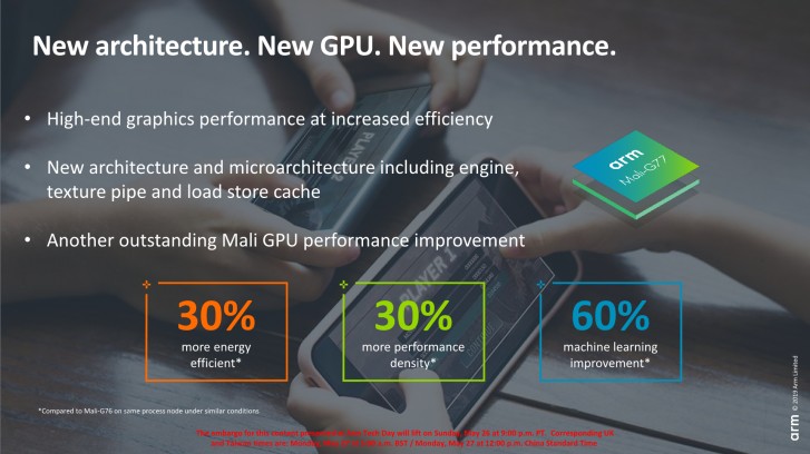 นั่นหมายความว่าตั้งแต่นี้ไปจนถึงปี 2020 เราจะเห็นการใช้งาน G77 GPU นี้มากขึ้นซึ่งคาดว่าจะช่วยให้ประสิทธิภาพในการทำงานของสมาร์ทโฟนดีขึ้นถึง 40% ซึ่งการเปลี่ยนแปลงนี้เป็นการเปลี่ยนแปลงรูปแบบการประมวลผลจาก 4 หรือ 8 wide เป็น 16 wide ซึ่งทาง ARM ได้ออกแบบดีไซน์ G77 GPU รุ่นใหม่นี้ให้สามารถเพิ่มพื้นที่ในการติดตั้งอุปกรณ์ลงในชิปเซ็ตเป็น 2 เท่าจาก G76 GPU