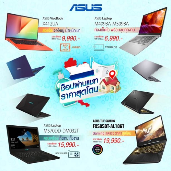 เอซุส (ประเทศไทย) ขอร่วมเป็นอีกหนึ่งกำลังใจให้คนไทยผ่านสถานการณ์แพร่ระบาดของโควิท – 19 มอบส่วนลดสำหรับโน้ตบุ๊ก 4 รุ่นยอดนิยม ได้แก่ M409BA, X412UA, M570DD และ FX505DT ทั้งเพิ่มความสะดวกสบายให้ลูกค้าที่สนใจหาซื้อโน้ตบุ๊กใหม่ ณ ช่วงเวลานี้ ด้วยบริการ ‘ช้อปผ่านแชท’ เพื่อสอบถามข้อมูลเพิ่มเติมหรือสั่งซื้อสินค้ากับตัวแทนจำหน่ายได้ผ่านเฟสบุ๊กร้านค้าไอทีชั้นนำ พร้อมบริการหลังการขายเต็มรูปแบบ หมดกังวลเรื่องปัญหาการใช้งานหลังการซื้อ
