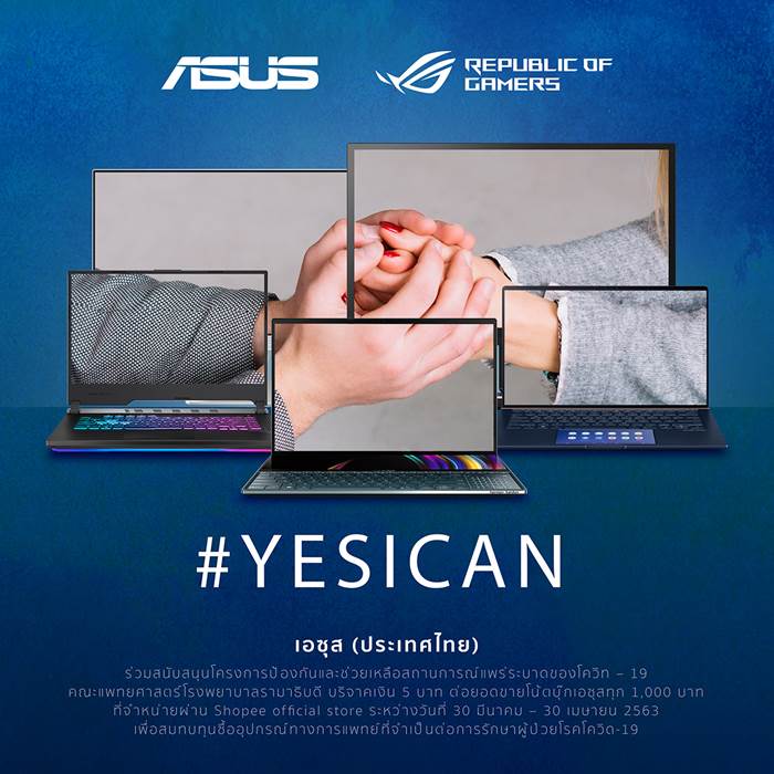 เอซุส (ประเทศไทย) ยังขอส่งกำลังใจให้เจ้าหน้าที่และบุคลากรทางการแพทย์ที่ได้ปฏิบัติหน้าที่เพื่อก้าวผ่านสถานการณ์นี้ไปด้วยกัน และขอร่วมสนับสนุนโครงการป้องกันและช่วยเหลือสถานการณ์แพร่ระบาดของโควิท – 19 คณะแพทยศาสตร์โรงพยาบาลรามาธิบดี บริจาคเงิน 5 บาท ต่อยอดขายโน้ตบุ๊กเอซุสทุก 1,000 บาท ที่จำหน่ายผ่าน Shopee official store https://shopee.co.th/asus_officialstore ระหว่างวันที่ 30 มีนาคม – 30 เมษายน 2563 เพื่อสมทบทุนซื้ออุปกรณ์ทางการแพทย์ที่จำเป็นต่อการรักษาผู้ป่วยโรคโควิด-19 ต่อไป