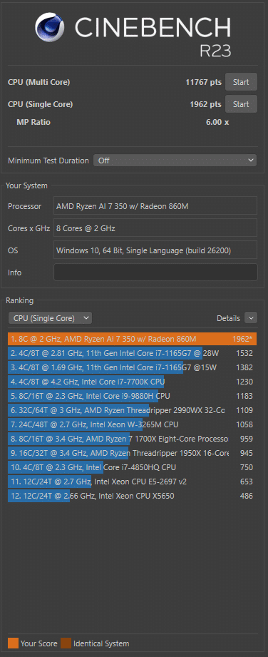 • CINEBENCH R23 : Single Core 1,962 / Multi Core 11,767