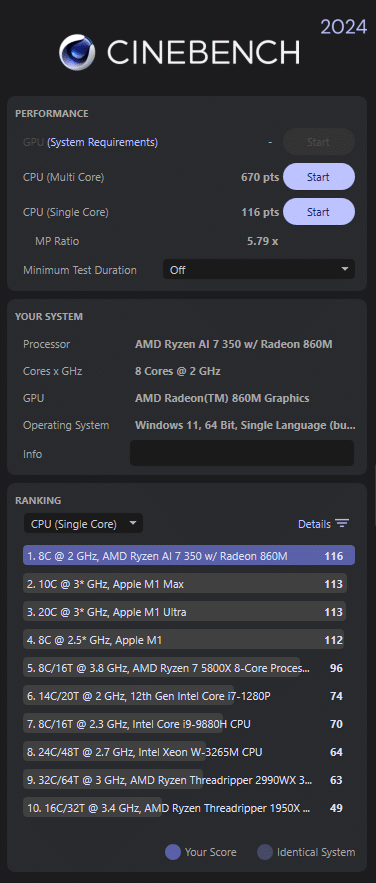 • CINEBENCH R24 : Single Core 116 / Multi Core 670
