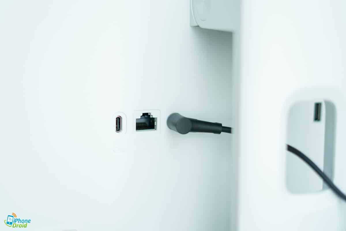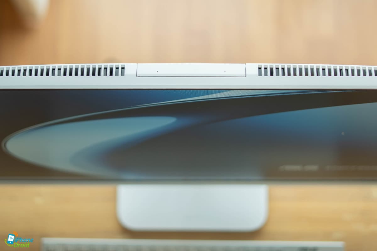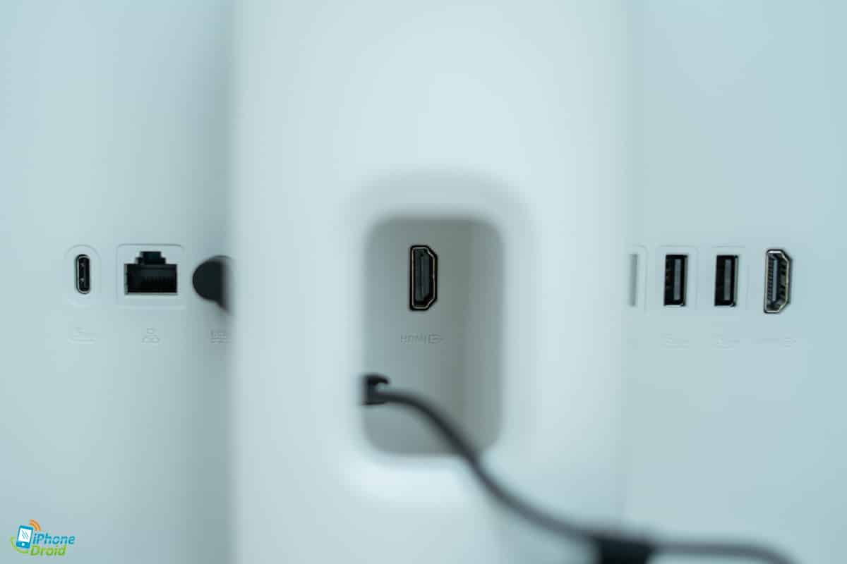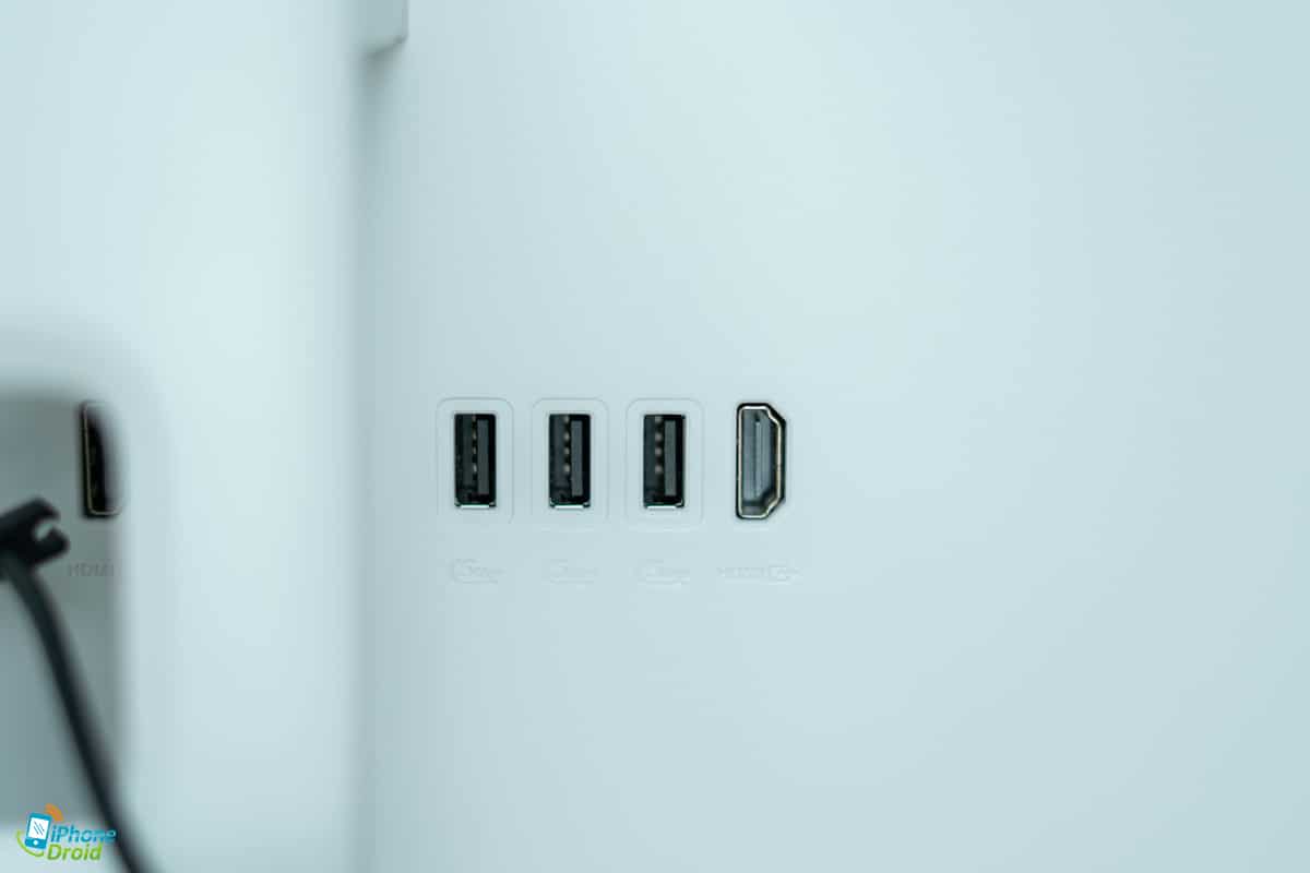 ที่ด้านล่างจอจะมีทั้ง Kensington Lock เพื่อป้องกันการถูกขโมย ตามด้วยช่องเสียบหูฟัง 3.5 มม. ปุ่มกดโหมดหน้าจอต่างๆ และพอร์ต USB 2.0 Type-A