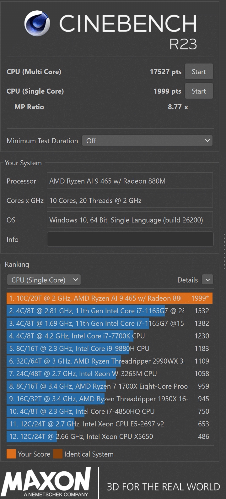 • CINEBENCH R23 : Single Core 1,999 / Multi Core 17,527