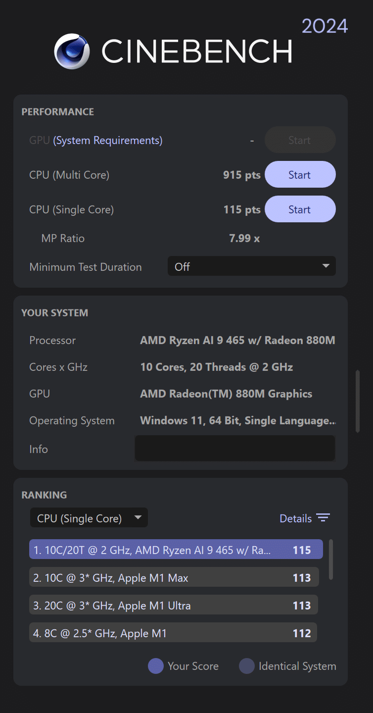 • CINEBENCH R24 : Single Core 115 / Multi Core 915
