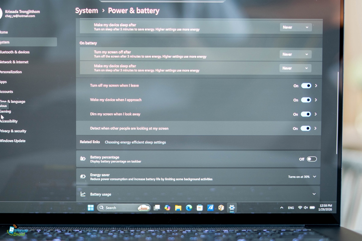 ตัวกล้องที่นอกจากจะใช้งานวิดีโอคอลในความละเอียด Full HD ได้แล้ว ก็ยังมีระบบ Windows Hello ในการสแกนใบหน้าเพื่อเสริมความปลอดภัยให้สูงขึ้นกว่าเดิมสำหรับการเข้าสู่ระบบ รวมถึงยังมีฟีเจอร์ Adaptive Lock ที่จะสามารถล็อคหน้าจอได้ทันทีหากเราลุกออกไปจากหน้าจอ หรือสามารถหรี่แสงหน้าจอลงได้เมื่อเราหันหน้าหนีออกจากจอครับ