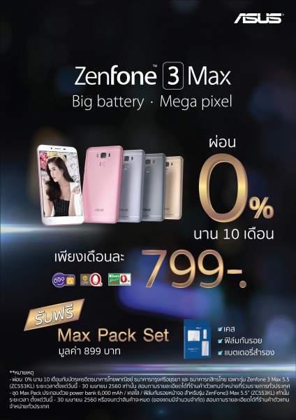 พบกับโปรโมชั่นแรงแห่งปี ต้อนรับสงกรานต์ให้คุณเป็นเจ้าของ ASUS ZenFone 3 Max 5.5 ได้ง่ายๆ กับโปรโมชั่นผ่อน 0% เพียงเดือนละ 799 บาท นาน 10 เดือน ผ่านบัตรเครดิตที่ร่วมรายการ พร้อมรับฟรี Max Pack Set ที่มาพร้อมกับ Powerbank ความจุ 6,000 mAh, เคสใสสำหรับ ASUS ZenFone 3 Max รุ่นหน้าจอ 5.5 นิ้ว และ ฟิล์มกันรอยหน้าจอ (รวมมูลค่า 899 บาท) ตั้งแต่วันนี้ ถึง 30 เมษายน 2560 หรือ จนกว่าของจะหมด