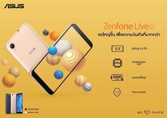 บริษัท เอซุส มาร์เก็ตติ้ง (ประเทศไทย) จำกัด เริ่มวางจำหน่าย ‘ZenFone Live (L1)’ สมาร์ทโฟนรุ่นล่าสุดแล้ววันนี้ นำเสนอหน้าจอ Full View 18:9 ขนาดใหญ่ 5.5 นิ้ว, แบตเตอรี่ความจุสูงกว่า 3000 mAh พร้อมระบบปลดล็อกด้วยใบหน้า เจาะกลุ่มลูกค้าที่มองหาสมาร์ทโฟนขนาดกะทัดรัด น้ำหนักเบา ใช้งานง่าย มาพร้อมสุดยอดประสบการณ์การใช้งานเพื่อความบันเทิงอย่างจุใจ