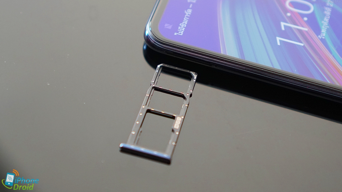 ขอบด้านซ้ายมีช่องถาดใส่ซิมแบบ 3 Slot สามารถใส่ซิมการ์ดได้ 2 ซิมและมีช่องเสียบการ์ด microSD ได้สูงสุด 2TB