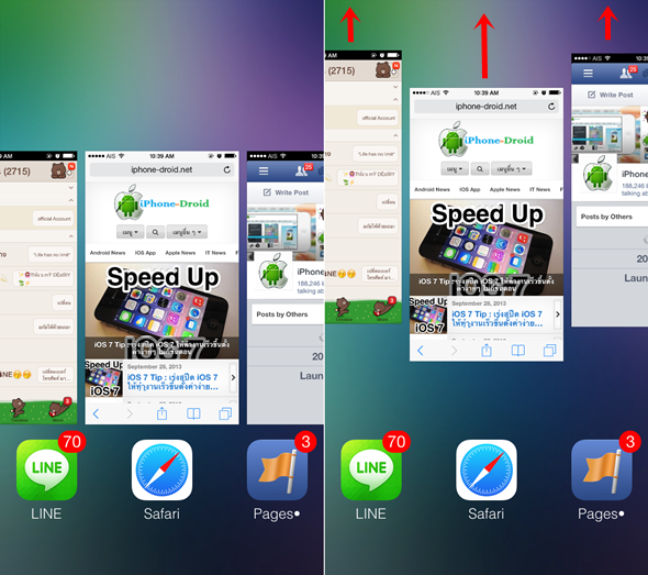 1. ให้ปิดแอพที่เปิดค้างไว้ทั้งหมด โดยการกดปุ่ม Home 2 ครั้ง หลังจากนั้นปิดแอพที่เปิดค้างไว้ทั้งหมดด้วยการปัดขึ้นแบบในภาพด้านล่างครับ สามารถปิดพร้อมกันได้สูงสุด 3 แอพ