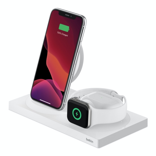 ที่ชาร์จแบบไร้สาย Belkin BOOST↑Charge 3-in-1 มาพร้อมพลังในการชาร์จให้กับอุปกรณ์ของ  Apple ไม่ว่าจะเป็นการชาร์จ iPhone รุ่นที่รองรับการชาร์จแบบไร้สาย โดยที่ชาร์จได้รับการรับรองมาตรฐาน Qi สามารถจ่ายพลังงานสูงสุด 7.5 วัตต์ นอกจากนี้ยังสามารถใช้ร่วมกับเคสได้ โดยสามารถชาร์จผ่านเคสส่วนใหญ่ที่มีความหนาไม่เกิน 3 มม. ได้ ขณะเดียวกันสามารถชาร์จ Apple Watch ได้พร้อมกัน นอกจากนี้แท่นแบบ 3-in-1 ยังมาพร้อมการชาร์จ AirPods หรือ AirPods Pro ทำให้สามารถชาร์จอุปกรณ์ทั้ง 3 ชิ้นได้จากที่ชาร์จเพียงตัวเดียวเหมาะอย่างยิ่งกับการใช้งานในห้องนอนหรือห้องทำงาน และมีไฟ LED ที่แสดงสถานะการชาร์จได้อย่างชัดเจนเพื่อความปลอดภัยอีกด้วย