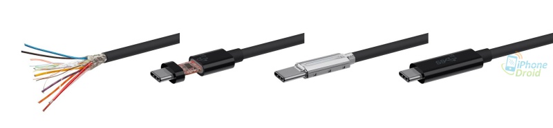 “ระบบสายของ USB Type-C รองรับปลั๊กหัวต่อสองด้านแบบ 24 pin ชนิดกลับด้านได้ ชิป E-marker ในตัว ระบุลักษณะเฉพาะของสายเคเบิลแต่ละเส้น รวมทั้งโหลดไฟฟ้าสูงสุดที่สายสามารถรองรับได้ ตัวชิปหุ้มด้วยฉนวนไฟฟ้าในกรอบโลหะ และปิดผนึกภายในกริปแบบเทอร์โมพลาสติก”