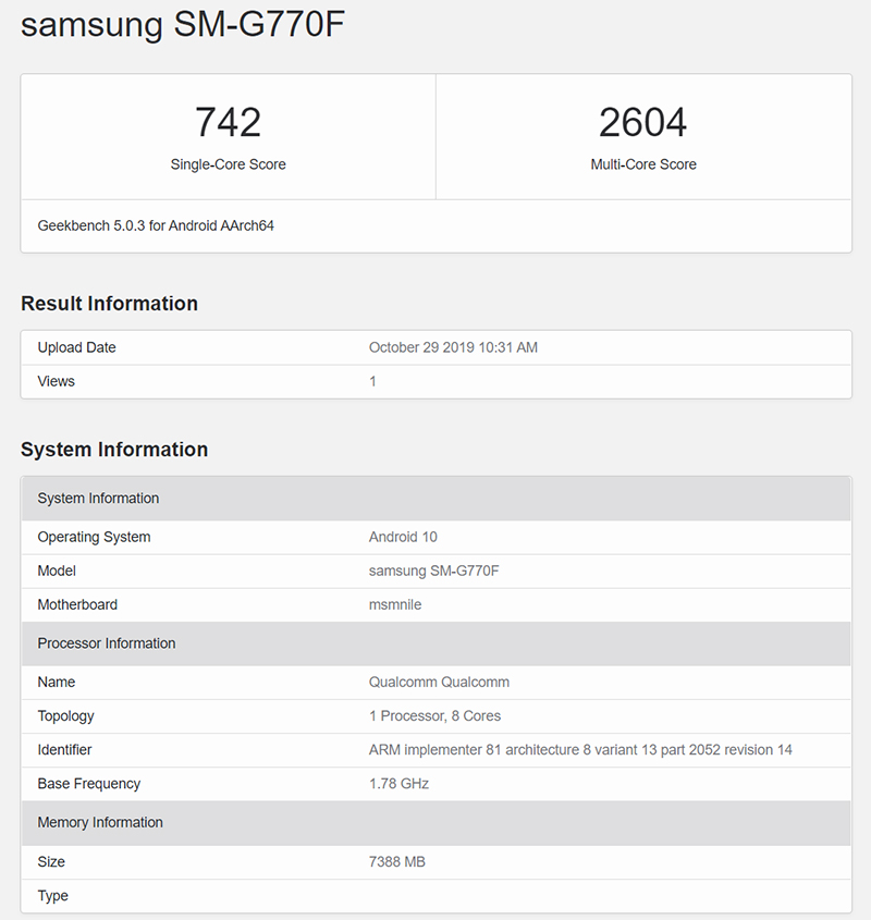 GeekBench ได้ผลคะแนนของ Galaxy S10 Lite ในส่วน Single-Core ที่ 742 และ Multi-Core ที่ 2,604 อย่างไรก็ตาม คะแนนที่ดูน้อยยังเป็นเพียงการทดสอบเบื้องต้นเท่านั้นครับ ส่วนเรื่องหน่วยประมวลผลคาดว่าจะใช้ Qualcomm Snapdragon 855 เหมือน Galaxy S10 Series ที่เปิดตัวไปก่อนหน้านี้ โดยจะมี RAM 8GB มากกว่า Galaxy S10e ที่ให้มา 6GB ทั้งยังรันบนระบบปฏิบัติการ Android 10 ด้วย