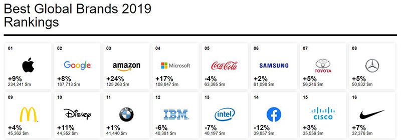 สำหรับแบรนด์ที่ได้อันดับ 1 ยังคงเป็น Apple ที่ทำมูลค่าสูงขึ้น 9% ที่ 234,241 ล้านเหรียญ ตามมาด้วย Google มูลค่าสูงขึ้น 8% ที่ 167,713 ล้านเหรียญ และอันดับ 3 กับ Amazon ที่มูลค่าสูงขึ้น 24% ที่ 125,263 ล้านเหรียญ โดยแบรนด์ที่น่าเป็นห่วงมากที่สุด คือ Facebook ที่ทำมูลค่าตกฮวบไปถึง 12% อยู่อันดับ 14 กับมูลค่า 39,857 ล้านเหรียญ ตกลงมาจากอันดับที่ 9 จากปี 2018 ซึ่งน่าจะเป็นผลมาทางเรื่องของคาวมเป็นส่วนตัวและปัญหาเรื้อรังด้านข่าวปลอม