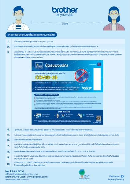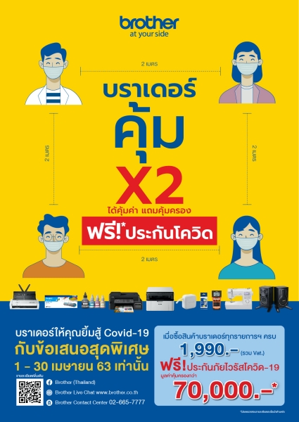 บราเดอร์ ช่วยลูกค้ายิ้มสู้ COVID-19 กับข้อเสนอพิเศษสุด ‘คุ้ม X 2 ได้คุ้มค่า แถมคุ้มครอง’ เมื่อซื้อสินค้าบราเดอร์ราคาพิ เศษทุกรายการครบ 1,990 บาท รับฟรี! ประกันภัยส่วนบุคคลคุ้ มครองการติดเชื้อ COVID-19  จากทิพยประกันภัย  จำนวนเงินเอาประกันภัย 70,000 บาท และคุ้มครองค่ารั กษาพยาบาลจากการติดเชื้อไวรั สโคโรนา 7,000 บาทต่อปี