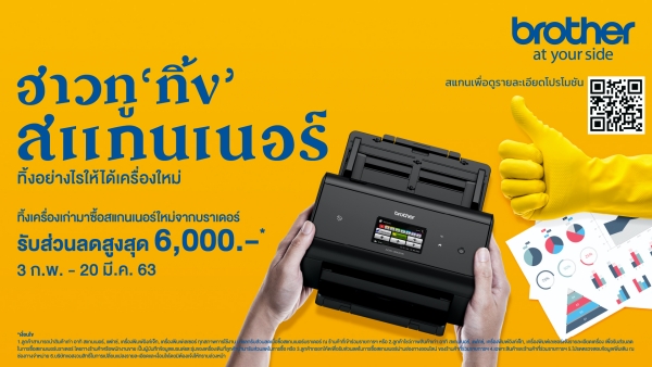 บราเดอร์ คอมเมอร์เชี่ยล (ประเทศไทย) เอาใจคนอยากทิ้ง จัดโปร ฮาวทู ‘ทิ้ง’ สแกนเนอร์ ทิ้งอย่างไรให้ได้เครื่องใหม่ ชวนนำสแกนเนอร์, แฟกซ์, เครื่องพิมพ์อิงค์เจ็ท, เครื่องพิมพ์เลเซอร์ ทุกสภาพการใช้งาน ทั้งสินค้าจริงหรือโชว์ภาพสินค้ าพร้อมรายละเอียด มาแลกรับส่วนลดสูงสุด 6,000 บาท เมื่อซื้อสแกนเนอร์บราเดอร์ ตามรุ่นที่กำหนด ราคาพิเศษเริ่มต้นตั้งแต่ 3,490 – 56,990 บาท วันนี้ – 20 มี.ค. 63 ณ ร้านค้าที่เข้าร่วมรายการฯทั่ วประเทศ หรือจะเลือกซื้อผ่านช่ องทางออนไลน์ LAZADA, SHOPEE และ JD Central ก็ได้เช่นกัน