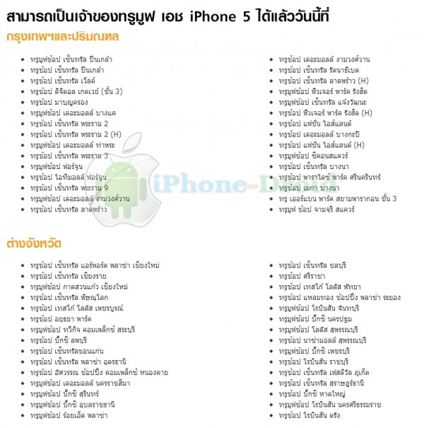 สำหรับผู้ที่ต้องการซื้อ iPhone 5 สามารถซื้อได้จากทรูช้อป สาขาดังต่อไปนี้ครับ แต่ขนาดความจุ สี สอบถามได้ที่ช้อปอีกทีนะครับ