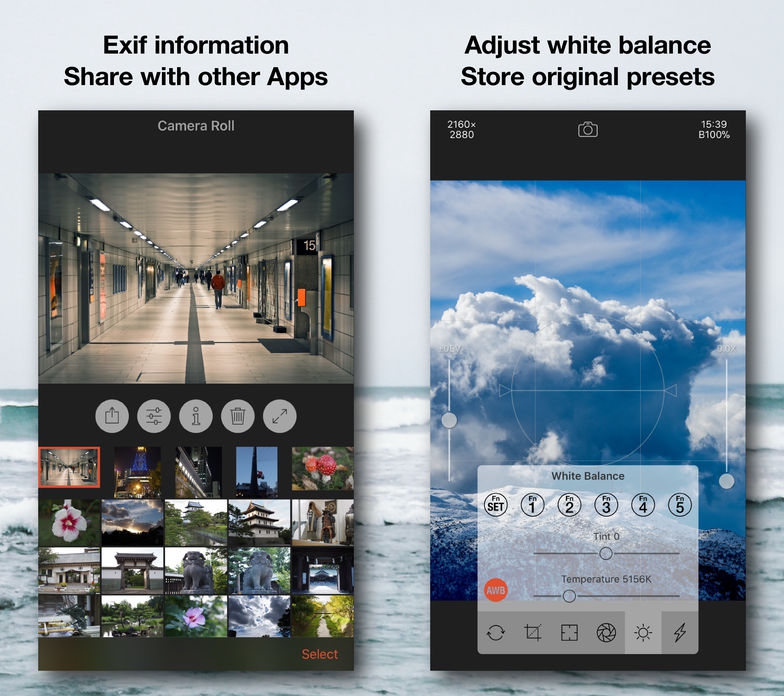 ตัวแอพออกแบบมาให้สามารถปัดหน้าจอไปทางซ้ายเพื่อเข้าสู่เมนูการตั้งค่าตัวแอพกล้อง Camera RX และปัดหน้าจอไปทางซ้ายเพื่อเลือกภาพถ่ายแล้วใช้เครื่องมือในการปรับแต่งภาพถ่าย
