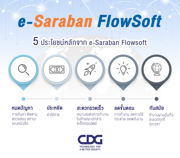 ทั้งนี้ ระบบ e-Saraban FlowSoft พัฒนาขึ้นโดย บริษัท ซีดีจี ซิสเต็มส์ จำกัด ในกลุ่มบริษัทซีดีจี ได้ขึ้นบัญชีนวัตกรรมไทย ฉบับเพิ่มเติมในเดือนเมษายน ปี 2561 และฉบับเพิ่มเติมในเดือนกรกฎาคม ปี 2561 เป็นระบบสารบรรณอิเล็กทรอนิกส์ ที่พัฒนาระบบขึ้นโดยคนไทยเพื่อสนับสนุนภาครัฐและรัฐวิสาหกิจให้สามารถบริหารงานเอกสารราชการจำนวนมหาศาลได้อย่างมีประสิทธิภาพ มุ่งสู่การเป็นสำนักงานไร้กระดาษ (Paperless Office) ช่วยประหยัดงบประมาณด้วยการจัดเก็บโดยระบบอิเล็กทรอนิกส์ โดยการจัดหมวดหมู่ ทำให้สามารถค้นหาเพื่อเรียกใช้งานได้อย่างรวดเร็ว ประหยัดเวลาในการค้นหาเอกสารและการจัดเก็บ อีกทั้งยังป้องกันการสูญหายของเอกสารราชการด้วยระบบรักษาความปลอดภัยเอกสารสำคัญอย่างรัดกุมอีกด้วย ศึกษารายละเอียดการใช้งานเพิ่มเติมได้ที่ http://www.cdgs.co.th/flowsoft/