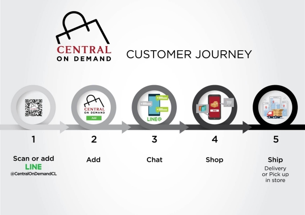 ขั้นตอนของการใช้บริการ CENTRAL On Demand ง่ายดายด้วยคอนเซ็ปต์ “Chat – Shop – Ship” เริ่มต้นจากการสแกนบาร์โค้ด CENTRAL On Demand ในห้างเซ็นทรัลและสื่อประชาสัมพันธ์ของห้าง หรือเสิร์ชหา @CentralOnDemand ตามด้วยสาขาที่ต้องการ ผ่านแอปพลิเคชั่น LINE จากนั้น แอดเป็นเพื่อน แล้วเริ่มแชตสอบถาม หรือหาสินค้าที่ต้องการ จากนั้นก็ช้อปปิ้งสินค้าชิ้นที่ต้องการผ่านช่องทางการชำระเงินที่ง่ายดาย เพียงเท่านี้ก็พร้อมรอรับสินค้าส่งตรงถึงบ้าน หรือเลือกรับสินค้าที่ห้างเซ็นทรัลสาขาที่สะดวก