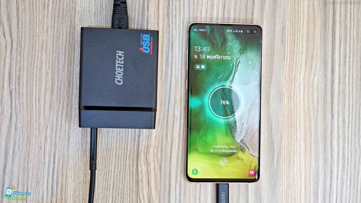 ทดสอบชาร์จ Samsung Galaxy S10+ ผ่านพอร์ต PD Type-C ด้วยสาย Thunderbolt 3 Cable ของ CHOETECH ซึ่งเป็นสายที่รองรับชาร์จด่วน จะเห็นว่าหน้าจอขึ้นข้อความว่าชาร์จด่วน ซึ่งก็หมายความว่าช่วยให้การชาร์จทำได้เร็วมากขึ้นเหมือนใช้หัวชาร์จที่มาในกล่องตอนซื้อ