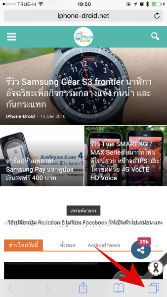 วิธีปิดแท็บใน Safari ที่เปิดค้างไว้เยอะๆ ทำได้ง่ายมากๆ ครับ เพียงแค่ แตะค้างไว้ ที่ด้านล่างขวามือที่เป็นรูปหน้าซ้อนกันตามภาพด้านล่างนี้นะครับ