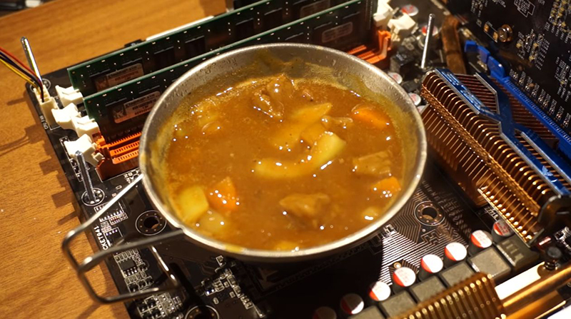 ชายชาวญี่ปุ่นคนนี้ได้ทำแกงกะหรี่ผ่าน CPU AMD Phenom II และได้เผยแพร่บน Youtube ช่อง “たれみみChannel” ของตัวเอง โดยเขาได้นำกระทะใบเล็กพิเศษขนาดเท่าๆ กับ CPU AMD แล้วทำการลงส่วนประกอบต่างๆ ในกระทะทันที ไม่ว่าจะเป็นเนื้อสัตว์, ผัก, เนย รวมถึงน้ำซุป ในอุณหภูมิ CPU ที่ประมาณ 71 องศา จนออกมาเป็นแกงกะหรี่