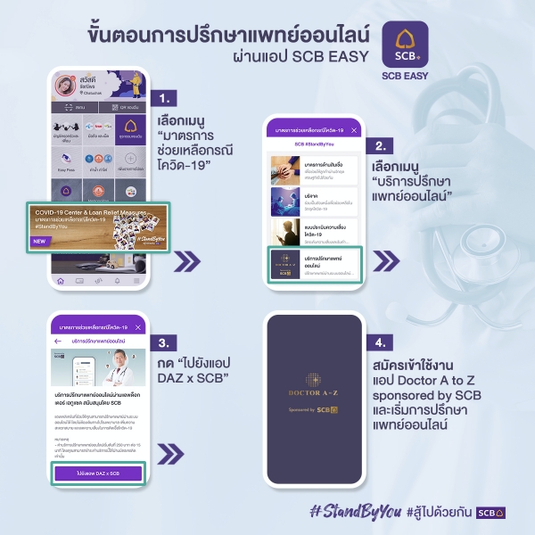 ด้วยสถานการณ์การแพร่ระบาดของโรคโควิด-19 ส่งผลกระทบต่อการดำเนินชีวิตของคนไทยในหลายมิติโดยเฉพาะความกังวลใจทางด้านสุขภาพ ธนาคารจึงใช้โอกาสนี้ขยายขีดความสามารถ SCB Healthcare Ecosystem นำเสนอทางเลือกให้ลูกค้าของธนาคารเข้าถึงบริการปรึกษาแพทย์ออนไลน์ (Tele-consultation) ได้อย่างสะดวกรวดเร็วผ่านแอปพลิเคชัน SCB Easy ลูกค้าสามารถทำการนัดหมายล่วงหน้ากับแพทย์ผู้เชี่ยวชาญเฉพาะทางเพื่อขอคำปรึกษาปัญหาสุขภาพโดยตรงโดยไม่ต้องเดินทางไปโรงพยาบาล ช่วยประหยัดเวลา ทั้งยังประหยัดค่าใช้จ่ายด้วยค่าบริการปรึกษาแพทย์เริ่มต้นที่ 250 บาทต่อ 15 นาที เชื่อถือได้ด้วยเครือข่ายทีมแพทย์ผู้เชี่ยวชาญครอบคลุมกลุ่มโรคต่างๆ อาทิ มะเร็ง กระดูกและข้อ หัวใจ หลอดเลือด และทางเดินอาหาร เป็นต้น การปรึกษาแพทย์ออนไลน์เช่นนี้เป็นที่นิยมใช้กันอย่างแพร่หลายแล้วในหลายประเทศทั้ง จีน อเมริกา และประเทศในแถบยุโรป สำหรับประเทศไทยเริ่มได้รับความสนใจมากขึ้นเรื่อยๆ โดยคาดว่าจะมีผู้เข้าปรึกษาแพทย์มากกว่า 1 ล้านคน ภายใน 3 ปี”
