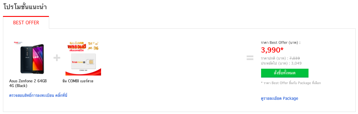 Asus Zenfone 2 แรม 4GB ความจุ 64GB เหลือเพียง 3,990 บาท จากราคา 6,990 บาท ได้รับส่วนลดค่าเครื่อง 3,000 บาท เมื่อเปิดเบอร์ใหม่ โดยจะได้รับซิมฟรี มูลค่า 49 บาท และสมัครแพ็กเกจรายเดือน 4G+ Super Smart 499 บาทขึ้นไป (ไม่รวมภาษีมูลค่าเพิ่ม) ระยะสัญญาการใช้บริการอย่างน้อย 12 เดือน