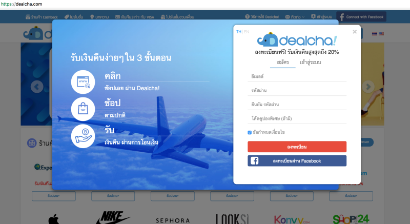 การจะซื้อสินค้าและได้เงินคืนจากดีลช่าจะต้องสมัครสมาชิกกันก่อนครับ โดยสามารถสมัครได้อย่างง่ายๆ ได้ทั้งการกรอกอีเมล์ และรหัสผ่าน หรือจะสมัครด้วยการลงทะเบียนผ่าน Facebook ก็ได้เช่นกัน หลังจากที่สมัครสมาชิกเรียบร้อยเพียงแค่นี้ก็พร้อมช้อปได้แล้ว