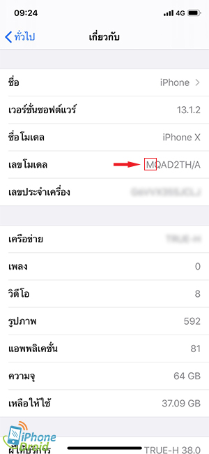 วิธีเช็คง่ายๆ ให้เราไปที่ การตั้งค่า > ทั่วไป > เกี่ยวกับ และให้สังเกตที่เลขโมเดลรุ่นว่าเป็นตัวอักษรอะไรขึ้นต้น