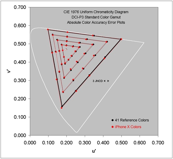 รายละเอียดหน้าจอของ iPhone X ที่ได้รับยกย่องว่าเป็นหน้าจอที่ดีที่สุดนั้น DisplayMate ให้ข้อมูลว่ามีการแสดงผลสีที่ถูกต้องที่สุดเท่าที่เคยวัดผลมา เหนือกว่าหน้าจอมือถือทุกรุ่น ทีวี หรือแม้แต่ UHD TV โดยมีทั้งระบบสี sRGB และ DCI-P3 อีกทั้งยังเป็นจอที่มีความสว่างที่สุดในบรรดาสมาร์ทโฟนที่มีหน้าจอ OLED คือสูงสุดที่ 634 nits เมื่อเทียบกับ Galaxy Note8 ที่ปรับสว่างได้สูงสุด 560 nits