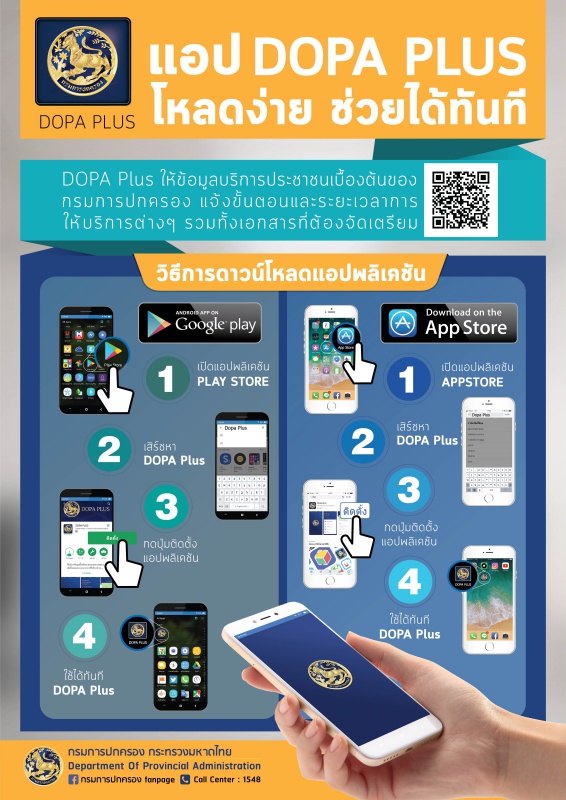 ติดต่องานราชการได้ง่าย เพียงดาวน์โหลดแอพพลิเคชัน “DOPA PLUS” รู้ทุกเรื่อง งานบริการ กรมการปกครอง สามารถดาวน์โหลดโดยไม่เสียค่ าใช้จ่ายแต่อย่างใด โดยใช้งานในอุปกรณ์เครื่องมือสื่ อสารผ่านระบบปฏิบัติการ iOS และ Android สอบถามข้อมูลเพิ่มเติม 02-221-8150
