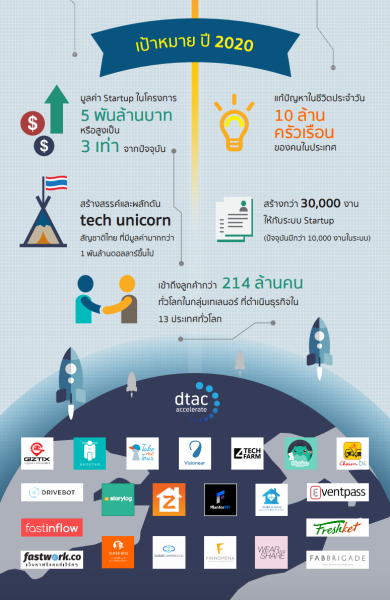 นายสมโภชน์ จันทร์สมบูรณ์ ผู้อำนวยการฝ่าย ดีแทค แอคเซอเลอเรท บริษัท โทเทิ่ล แอ็คเซ็ส คอมมูนิเคชั่น จำกัด (มหาชน) หรือดีแทค เปิดเผยว่า “ดีแทค แอคเซอเลอเรท เริ่มต้นโครงการบ่มเพาะสตาร์ตอัพไทย เมื่อ 5 ปีที่แล้ว ตั้งแต่ปี 2555 ตลอดระยะเวลาที่ผ่านมา ดีแทค แอคเซอเลอเรทได้พัฒนาขึ้นมาจนมีหลักสูตร และกูรูที่มาให้ความรู้ เทียบเท่าโครงการบ่มเพาะสตาร์ตอัพระดับโลก  รวมทั้งความสามารถและไอเดียของสตาร์ตอัพไทยก็มีความสามารถมากขึ้นไม่น้อยหน้าต่างชาติ เรามีตัวเลขที่น่าสนใจ จากครอบครัว ดีแทค แอคเซอเลอเรท โครงการบ่มเพาะสตาร์ทอัพมือ 1 ของไทย มาแชร์กันในแง่มุมเม็ดเงินลงทุน หลักสูตร มูลค่าของสตาร์ตอัพในโครงการ เราหวังว่า ประเทศไทยจะมีสตาร์ตอัพดาวรุ่งมาประดับวงการอีกไม่น้อย จากการร่วมมือร่วมใจของภาครัฐและเอกชนที่จะมุ่งส่งเสริมให้สตาร์ตอัพไทย เป็นอีกหนึ่งกำลังสำคัญที่ช่วยสร้างสรรค์ให้ประเทศไทย ก้าวไปสู่ไทยแลนด์ 4.0 ได้อย่างรวดเร็ว”