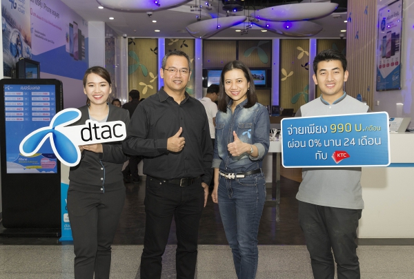 นางสาวปริศนา รัตนสุวรรณศรี ผู้อำนวยการอาวุโส สายงานการตลาด ธุรกิจโพสต์เพด บริษัท โทเทิ่ล แอ็คเซ็ส คอมมูนิเคชั่น จำกัด (มหาชน) หรือดีแทค และ นายวุธินันท์ สุวิมลพันธุ์ ผู้จัดการฝ่ายการตลาด-ธุรกิจร้านค้า “เคทีซี” หรือ บริษัท บัตรกรุงไทย จำกัด (มหาชน) ร่วมกันจัดโปรโมชันสุดพิเศษที่แรกให้ลูกค้าได้เป็นเจ้าของสมาร์ทโฟนที่ใครๆ ก็อยากได้ เริ่มเปิดตัวด้วย iPhone 6 32GB และ iPhone 6s Plus 32GB ง่ายๆ เพียงแบ่งชำระ KTC FLEXI 0% นาน 24 เดือน ผ่านบัตร “เคทีซี พราว” พร้อมใช้แพ็กเกจGO No Limit ในราคาเบาๆ แบบเหมาจ่ายเริ่มต้นเพียงเดือนละ 990 บาท พิเศษ! พร้อมข้อเสนอ