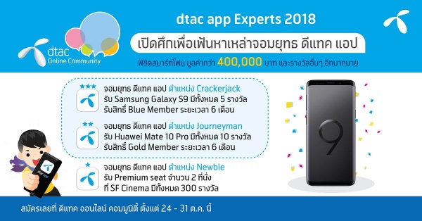- ผู้ชนะที่ได้ตำแหน่ง“dtac app Crackerjack” 5 คนแรกเท่านั้น จะได้รับ Samsung Galaxy S9 Plus จำนวน 1 เครื่อง มูลค่า 37,900 บาท พร้อมรับสิทธิเป็น Blue Member ระยะเวลา 6 เดือน