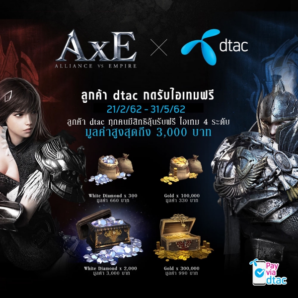 - ซื้อไอเทมในเกมผ่านระบบชำระเงินของดีแทค (Pay via dtac)รับโบนัสพิเศษ! ได้เพชรเพิ่ม 50% เฉพาะช่องทางดีแทคเท่านั้น