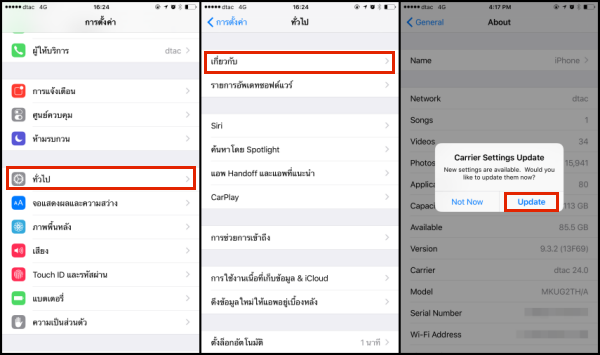 2. อัพเดท Carrier bundle เป็น version ล่าสุด เข้าไปที่ การตั้งค่า > ทั่วไป > เกี่ยวกับ > อัพเดท (Settings > General > About > Carrier bundle Update > Update)