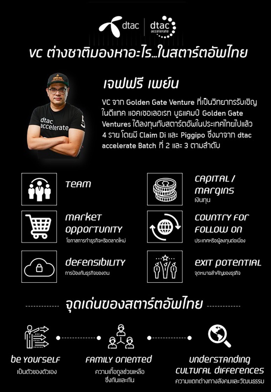 สตาร์ตอัพไทยเป็นนักรบเศรษฐกิจที่จะช่วยผลักดันประเทศไปสู่ไทยแลนด์ 4.0 แต่อัตราการอยู่รอดของสตาร์ตอัพยังไปไม่ถึงไหน สตาร์ตอัพในปัจจุบันยังคงย่ำอยู่กับที่หรือล้มหายไปตามกระแส ซึ่งเหลือเพียง 1% เท่านั้นที่สามารถอยู่รอดและเติบโตต่อไปได้เพราะมีเงินลงทุนจาก VC ที่จะทำธุรกิจอย่างเพียงพอในแต่ละรอบของการหาเงินทุน ดังนั้นการเข้าใจอย่างลึกซึ้งว่า VC ต่างชาติมองหาอะไรในตัวสตาร์ตอัพไทยเป็นสิ่งสำคัญ นับเป็นโอกาสอันดีที่สุดยอดนักลงทุนระดับเอเชีย เจฟฟรี เพย์นผู้ร่วมก่อตั้งและนักลงทุนชื่อดังของ Golden Gate Ventures ที่มีประสบการณ์ในการทำงานเป็นที่ปรึกษาให้กับบริษัทสตาร์ทอัพมาก่อน และเป็นหนึ่งในเทรนเนอร์ที่มีความเชี่ยวชาญด้านการลงทุนจากโครงการ ดีแทค เอคเซอเลอเลท batch 5 ได้มาเผยถึง
