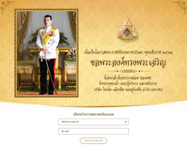 บริษัท โทเทิ่ล แอ็คเซ็ส คอมมูนิเคชั่น จำกัด (มหาชน) หรือดีแทค ให้ความสำคัญเป็นอย่างยิ่งกับพิธีมหามงคลที่จะเกิดขึ้นในช่วงระหว่างวันที่ 4 – 6 พฤษภาคม 2562 จึงขอเชิญชวนลูกค้าดีแทคและประชาชนร่วมเป็นส่วนหนึ่งในประวัติศาสตร์พระราชพิธีบรมราชาภิเษก ในหลวง รัชกาลที่ 10 ตามวันสำคัญดังกล่าว และขอเชิญร่วมถวายพระพรชัยมงคล น้อมสำนึกในพระมหากรุณาธิคุณ ผ่านเว็บไซด์ www.dtac.co.th/KingRamaX โดยเลือกคำถวายพระพรชัยมงคล พร้อมลงชื่อ นามสกุล ได้ตั้งแต่วันที่ 5 พฤษภาคม 2562 ซึ่งจะรวบรวมนำส่งให้กับสำนักพระราชวังในลำดับต่อไป