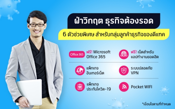 รายละเอียดเพิ่มเติม “ฝ่าวิกฤตโควิด ธุรกิจต้องรอด” คลิก: www.dtac.co.th/business/covid19 หรือโทร 088-188-1678 หรือ *1806 สำหรับเบอร์ดีแทค