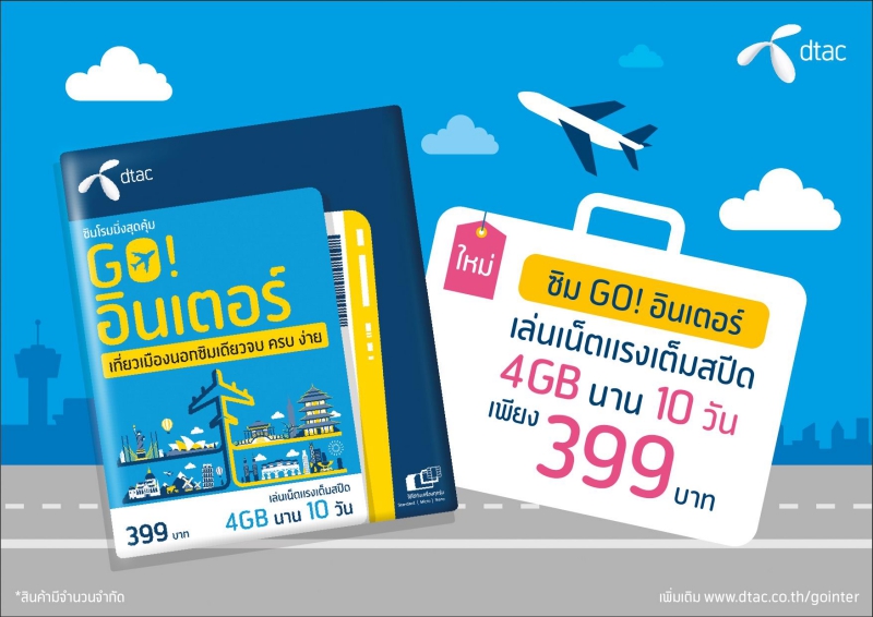 ดีแทคเปิดตัวซิมใหม่ล่าสุด สำหรับผู้ที่เดินทางไปท่องเที่ยว หรือทำงานในต่างประเทศ ลูกค้าเครือข่ายไหนก็สามารถใช้งานได้ กับ ซิม GO! อินเตอร์ของดีแทค ในราคาเพียง 399 บาท ใช้งานอินเทอร์เน็ตในต่างประเทศ แบบ Non-stop ด้วยความเร็วสูงสุดได้จำนวน 4 GB นาน 10 วัน ซึ่งนอกจากปริมาณการใช้งานเน็ตที่คุ้มค่าแล้ว ในแพ็กเกจซิมยังมีที่จิ้มซิม และซองพลาสติกสำหรับเก็บซิม ที่มีให้พิเศษเฉพาะลูกค้าซิม GO! อินเตอร์เท่านั้น ส่วนวิธีการใช้งานนั้นง่ายมาก แค่เสียบซิมก็สามารถใช้งานได้เลยใน 23 ประเทศทั่วโลก ได้แก่ ญี่ปุ่น, จีน, ฮ่องกง, ไต้หวัน, สิงคโปร์, มาเลเซีย, อินโดนีเซีย, ลาว, พม่า, กัมพูชา, ปากีสถาน, บังคลาเทศ, ออสเตรเลีย, สวิตเซอร์แลนด์, อิตาลี, ออสเตรีย, ฮังการี, นอร์เวย์, สวีเดน, บัลแกเรีย, เซอร์เบีย, มอนเตเนโกร และสหรัฐอเมริกา
