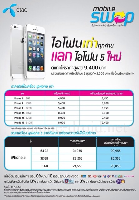 มาแล้วโปรโมชั่นจากดีแทคเอาใจสาวก iPhone ที่มีเครื่องเก่า iPhone 4/4S ทุกค่าย นำมาแลกซื้อ iPhone 5 ใหม่ด้วยข้อเสนอสุดคุ้มรับส่วนลดค่าเครื่องสูงสุดถึง 9,400 บาท