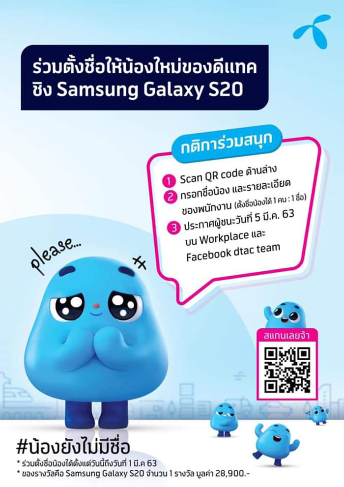 นอกจากที่ DTAC จะเปิดตัวน้องมาสคอตสุดน่ารัก แต่ในตอนนี้ก็ยังไม่มีชื่ออย่างเป็นทางการ ทาง DTAC เลยให้เราได้ร่วมสนุกกับกิจกรรม “น้อง…ยังไม่มีชื่อ” กันครับ โดยผู้ที่เข้าร่วมประกวดตั้งชื่อให้น้อง จะได้รับโอกาสชิงสมาร์ทโฟน Samsung Galaxy S20 รวมทั้งหมดถึง 5 เครื่อง