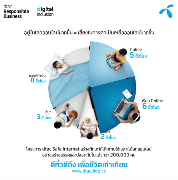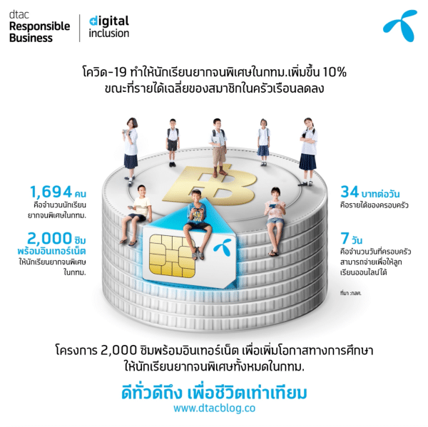 ในช่วงโควิด-19 ที่ผ่านมา ดีแทคได้สนับสนุน 2,000 ซิมพร้อมแพ็กเก็จเน็ตอันลิมิเต็ดความเร็ว 4 Mbps แก่กลุ่มเด็กนักเรียนยากจนพิเศษ ของ กสศ. นำร่องในเขตกรุงเทพฯ สำหรับการเรียนออนไลน์เป็นการเร่งด่วนลดอุปสรรคการเรียนรู้ เตรียมพร้อมหาทางออกระยะยาวในยุคเรียนออนไลน์ มุ่งสู่เป้าหมายความเท่าเทียมทางดิจิทัล (Digital inclusion) และลดการปิดกั้นแม้เกิดสถานการณ์โควิด-19